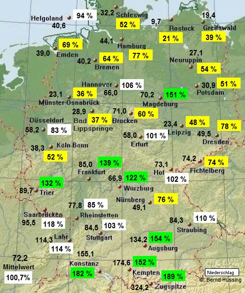 Niederschlagssumme, dahinter die Prozente im Vergleich zum langjährigen Mittel (1961-1990)