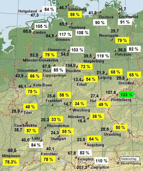 Niederschlagssumme, dahinter die Prozente im Vergleich zum langjährigen Mittel (1961-1990)