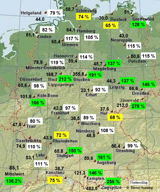 Niederschlagssumme, dahinter die Prozente im Vergleich zum langjährigen Mittel (1961-1990)