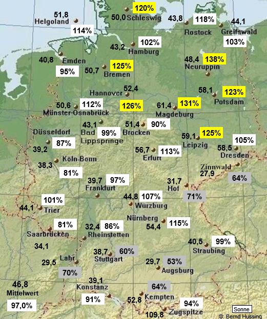 Sonnenscheinsumme, dahinter die Prozente im Vergleich zum langjährigen Mittel (1961-1990)
