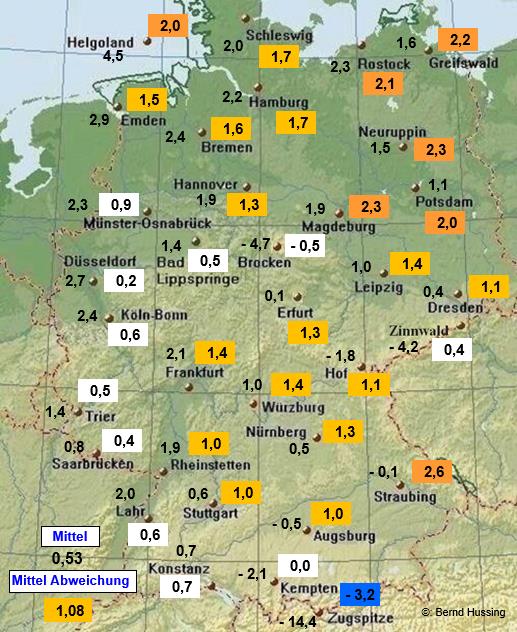 Temperaturmittel, dahinter die Abweichung zum langjährigen Mittel (1961-1990)