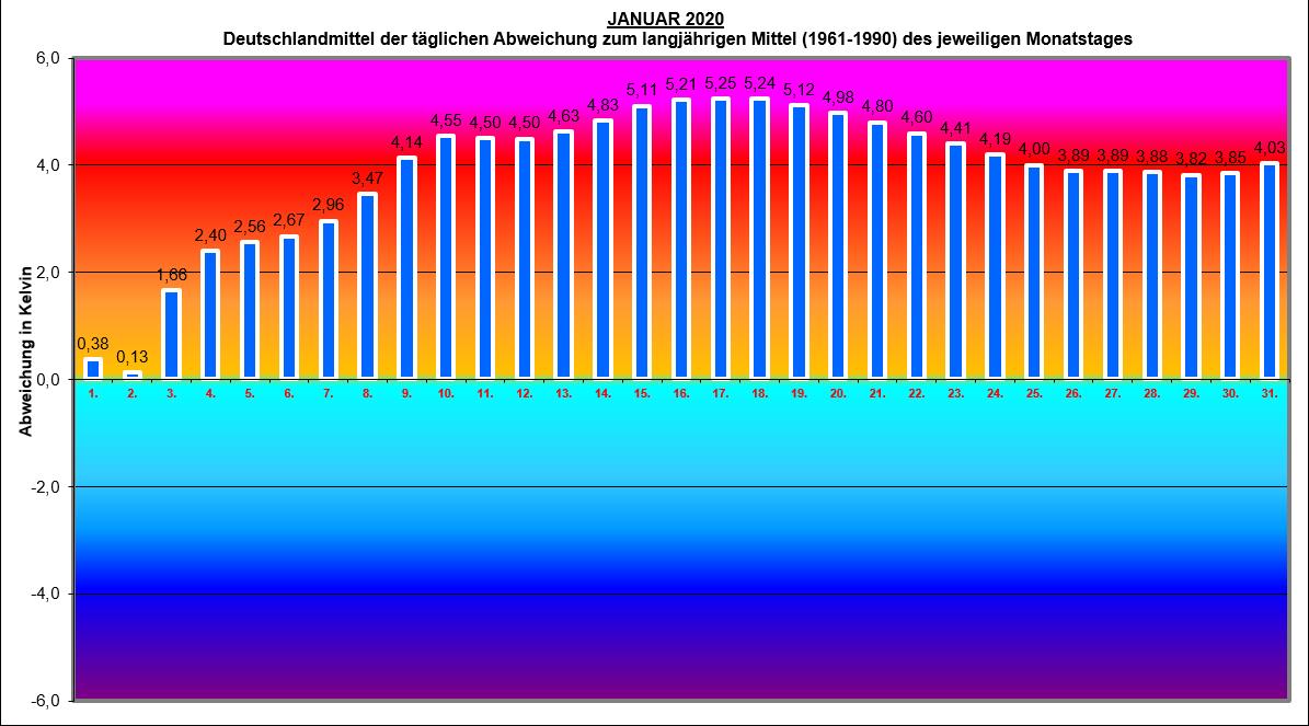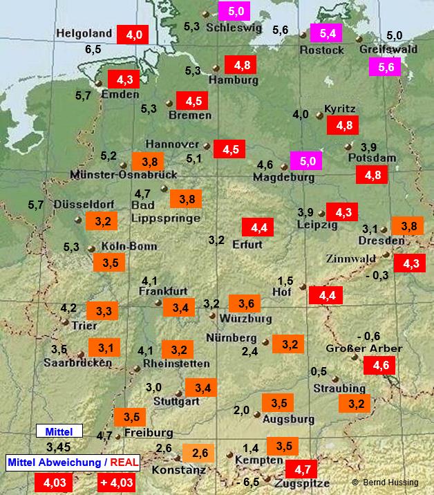Temperaturmittel, dahinter die Abweichung zum langjährigen Mittel (1961-1990)