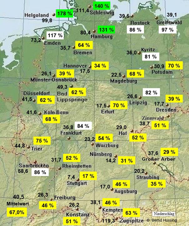 Niederschlagssumme, dahinter die Prozente im Vergleich zum langjährigen Mittel (1961-1990)