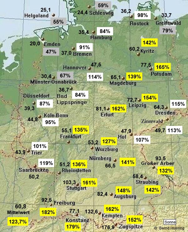 Sonnenscheinsumme, dahinter die Prozente im Vergleich zum langjährigen Mittel (1961-1990)
