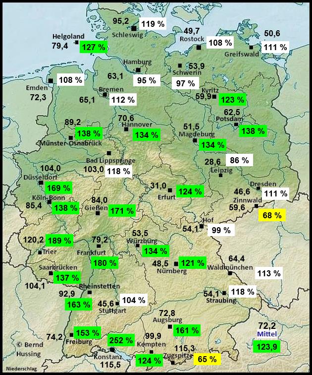 Niederschlagssumme, dahinter die Prozente im Vergleich zum langjährigen Mittel (1991-2020)