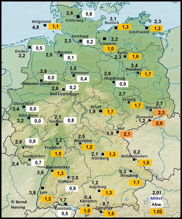 Temperaturmittel, dahinter die Abweichung zum langjährigen Mittel (1991-2020)