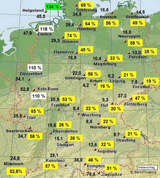Niederschlagssumme, dahinter die Prozente im Vergleich zum langjährigen Mittel (1961-1990)