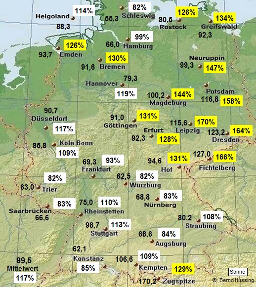 Sonnenscheinsumme, dahinter die Prozente im Vergleich zum langjährigen Mittel (1961-1990)