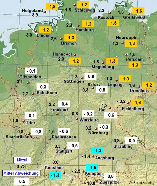 Temperaturmittel, dahinter die Abweichung zum langjährigen Mittel (1961-1990)