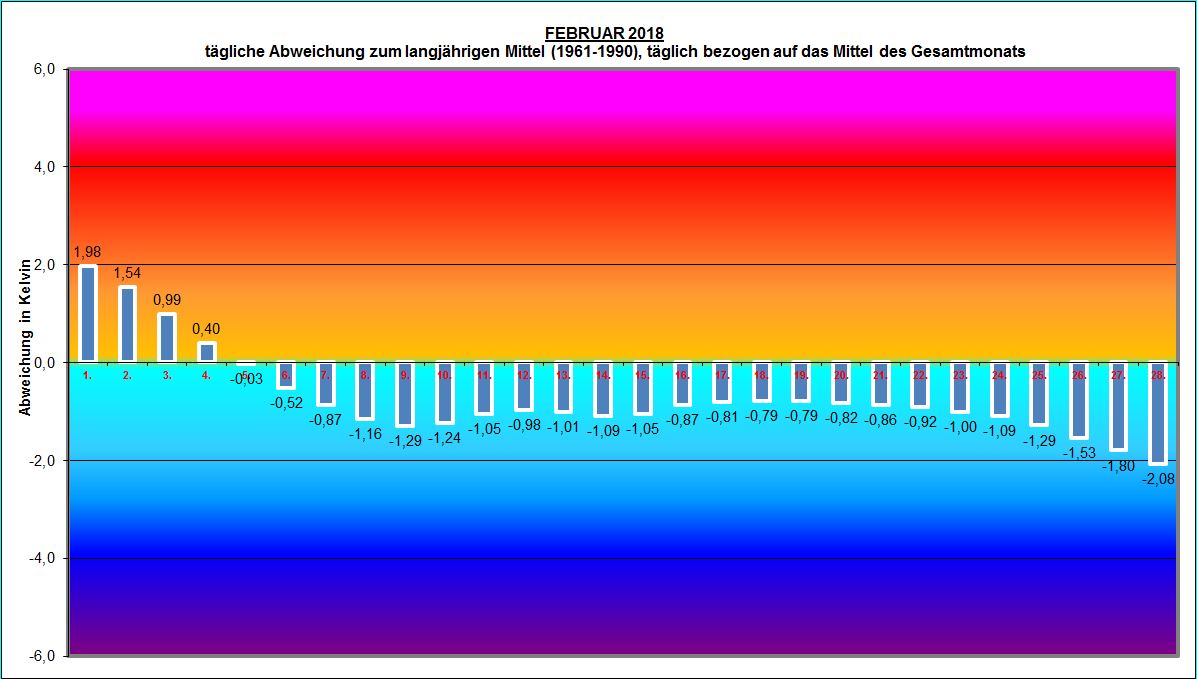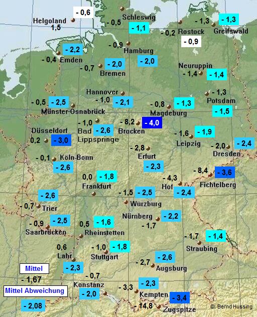 Temperaturmittel, dahinter die Abweichung zum langjährigen Mittel (1961-1990)