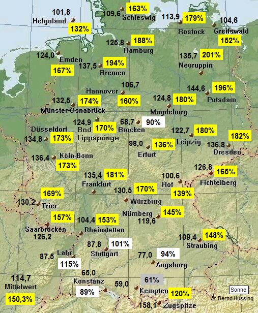 Sonnenscheinsumme, dahinter die Prozente im Vergleich zum langjährigen Mittel (1961-1990)