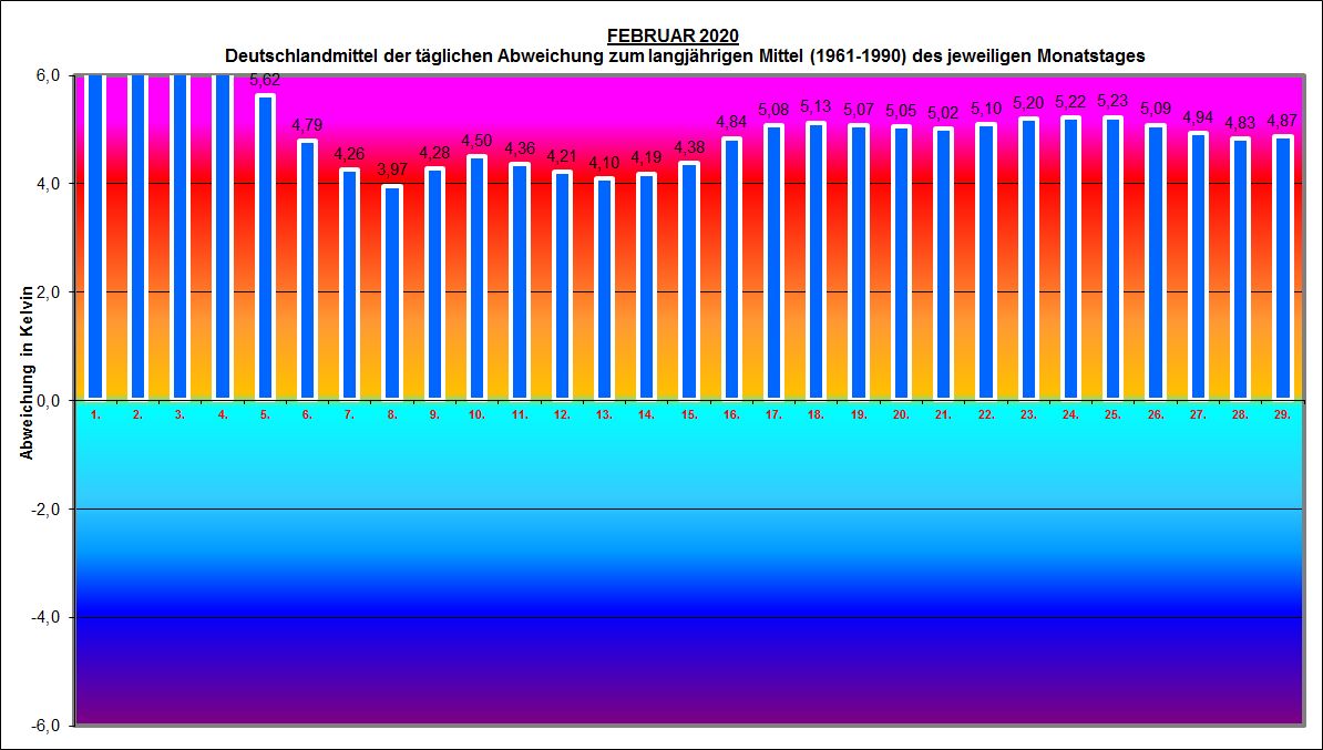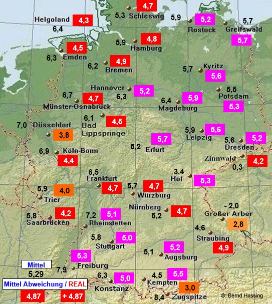 Temperaturmittel, dahinter die Abweichung zum langjährigen Mittel (1961-1990)