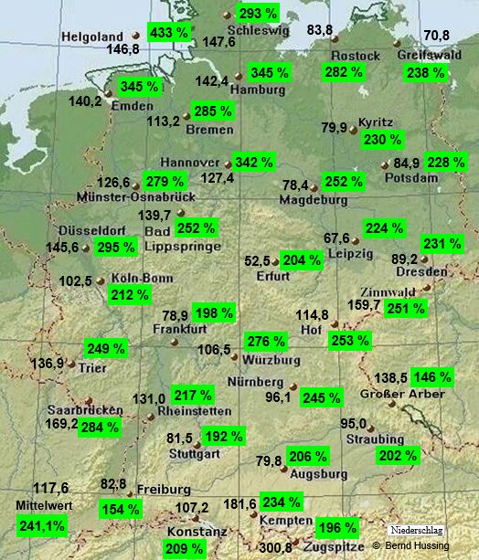 Niederschlagssumme, dahinter die Prozente im Vergleich zum langjährigen Mittel (1961-1990)