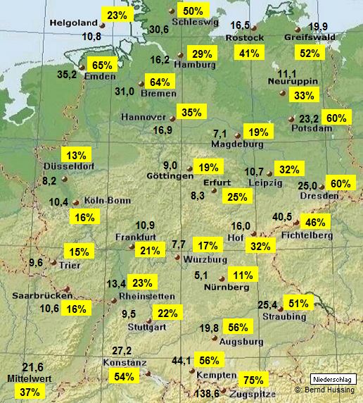 2. Niederschlagssumme, dahinter die Prozente im Vergleich zum langjährigen Mittel (1961-1990)