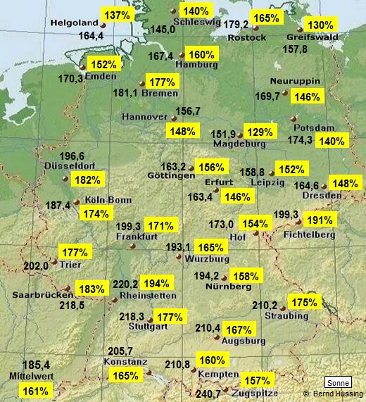 3. Sonnenscheinsumme, dahinter die Prozente im Vergleich zum langjährigen Mittel (1961-1990)