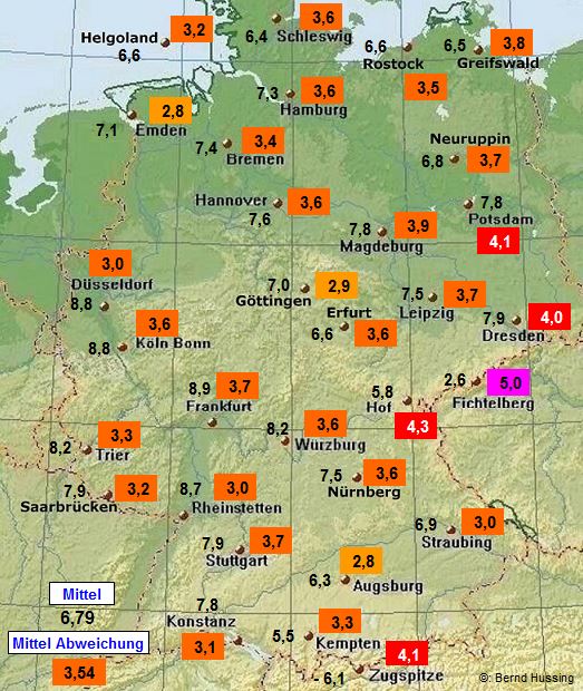 1. Temperaturmittel, dahinter die Abweichung zum langjährigen Mittel (1961-1990)