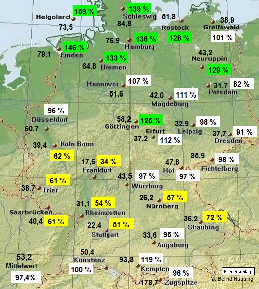 Niederschlagssumme, dahinter die Prozente im Vergleich zum langjährigen Mittel (1961-1990)