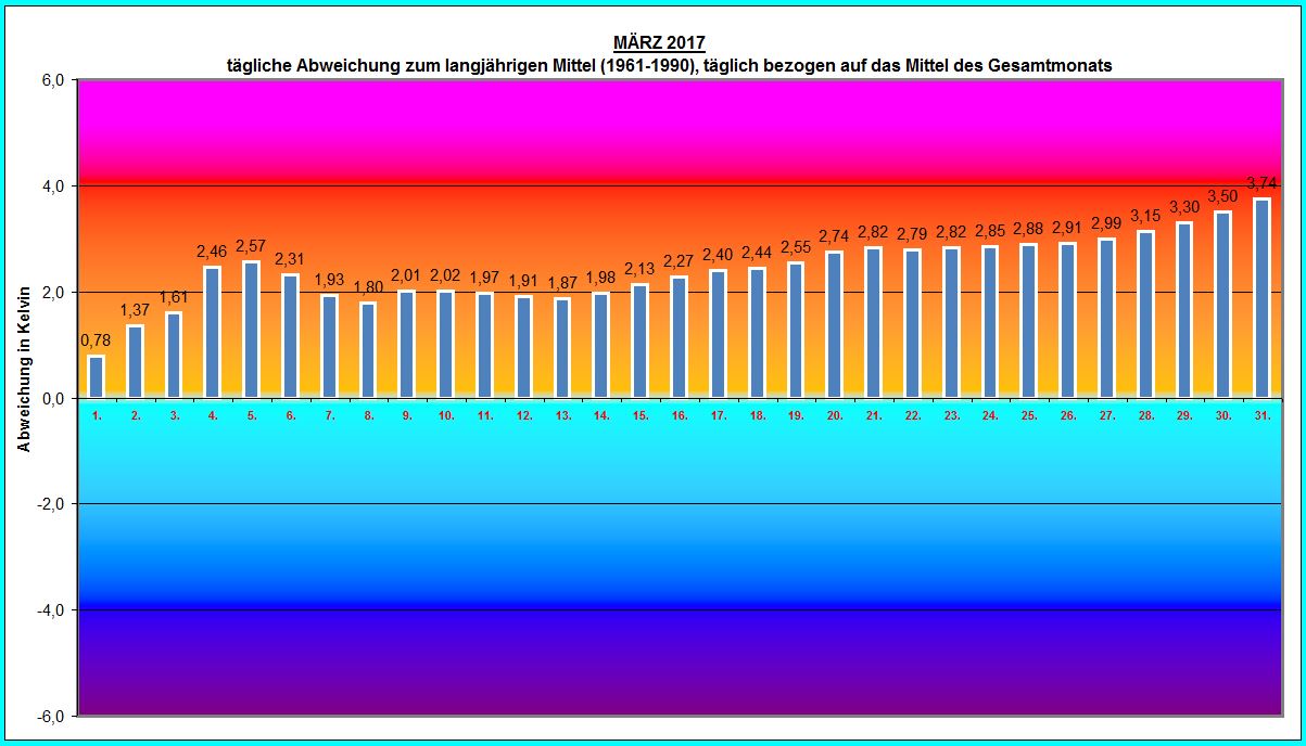 Temperaturmittel, dahinter die Abweichung zum langjährigen Mittel (1961-1990)