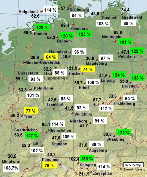Niederschlagssumme, dahinter die Prozente im Vergleich zum langjährigen Mittel (1961-1990)