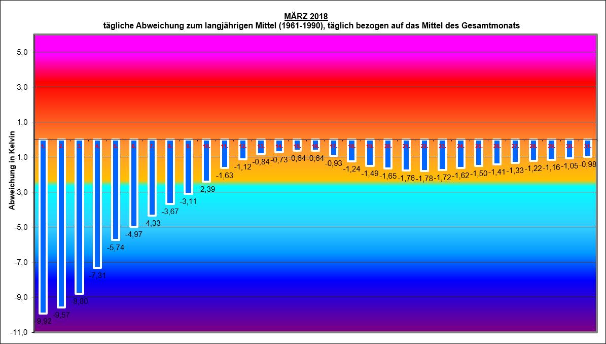Temperaturmittel, dahinter die Abweichung zum langjährigen Mittel (1961-1990)