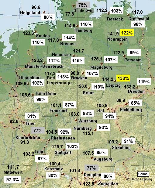 Sonnenscheinsumme, dahinter die Prozente im Vergleich zum langjährigen Mittel (1961-1990)