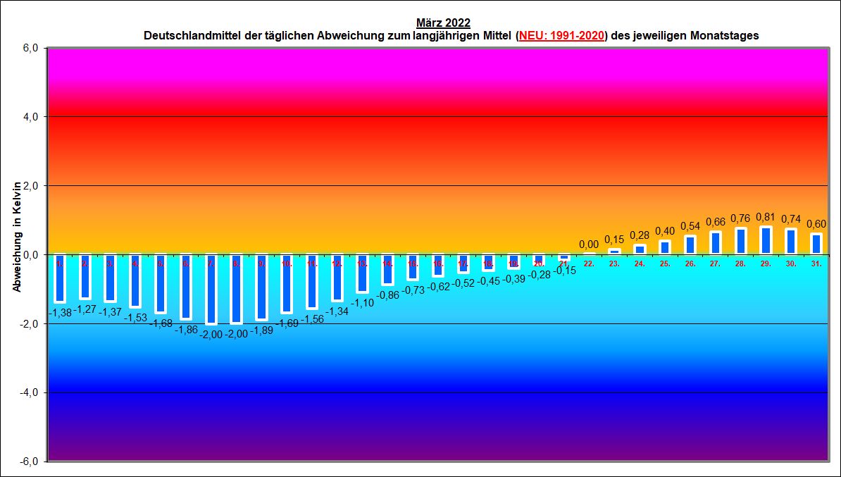 Temperaturmittel, dahinter die Abweichung zum langjährigen Mittel (1991-2020)