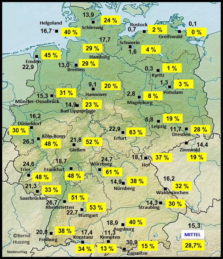 Niederschlagssumme, dahinter die Prozente im Vergleich zum langjährigen Mittel (1991-2020)