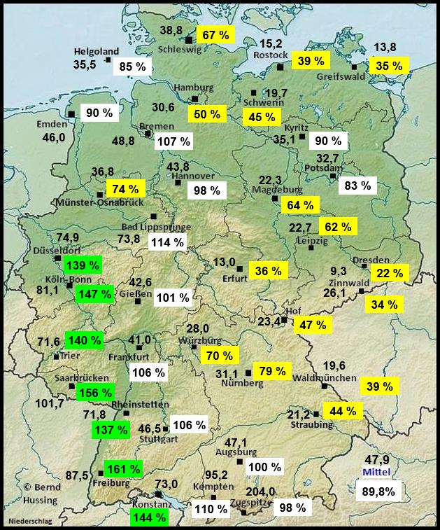 Niederschlagssumme, dahinter die Prozente im Vergleich zum langjährigen Mittel (1991-2020)