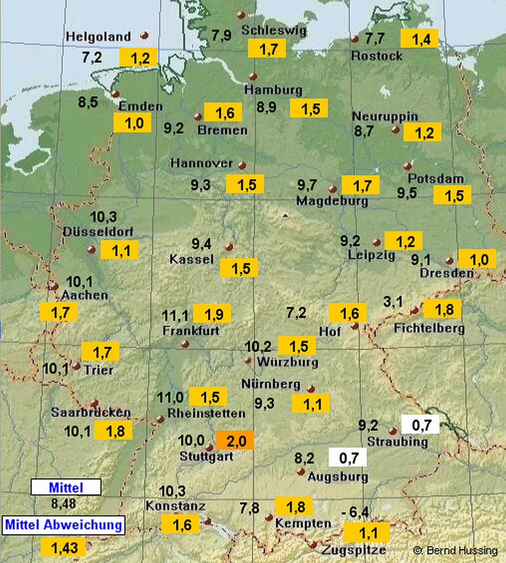 Temperaturmittel, dahinter die Abweichung zum langjährigen Mittel 1961-1990