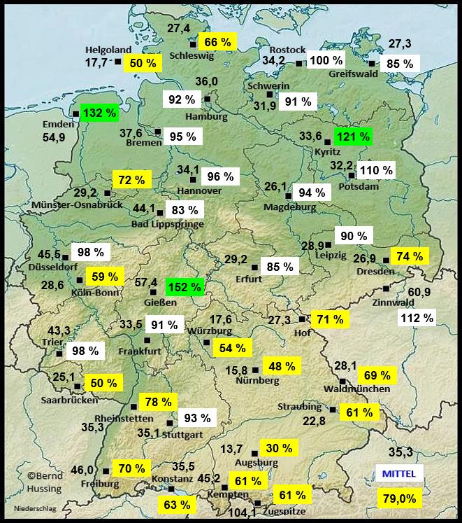 Niederschlagssumme, dahinter die Prozente im Vergleich zum langjährigen Mittel (NEU: 1991-2020)