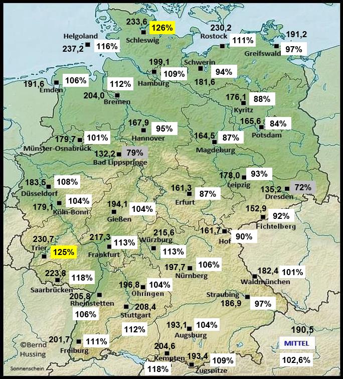 Sonnenscheinsumme, dahinter die Prozente im Vergleich zum langjährigen Mittel (NEU: 1991-2020)