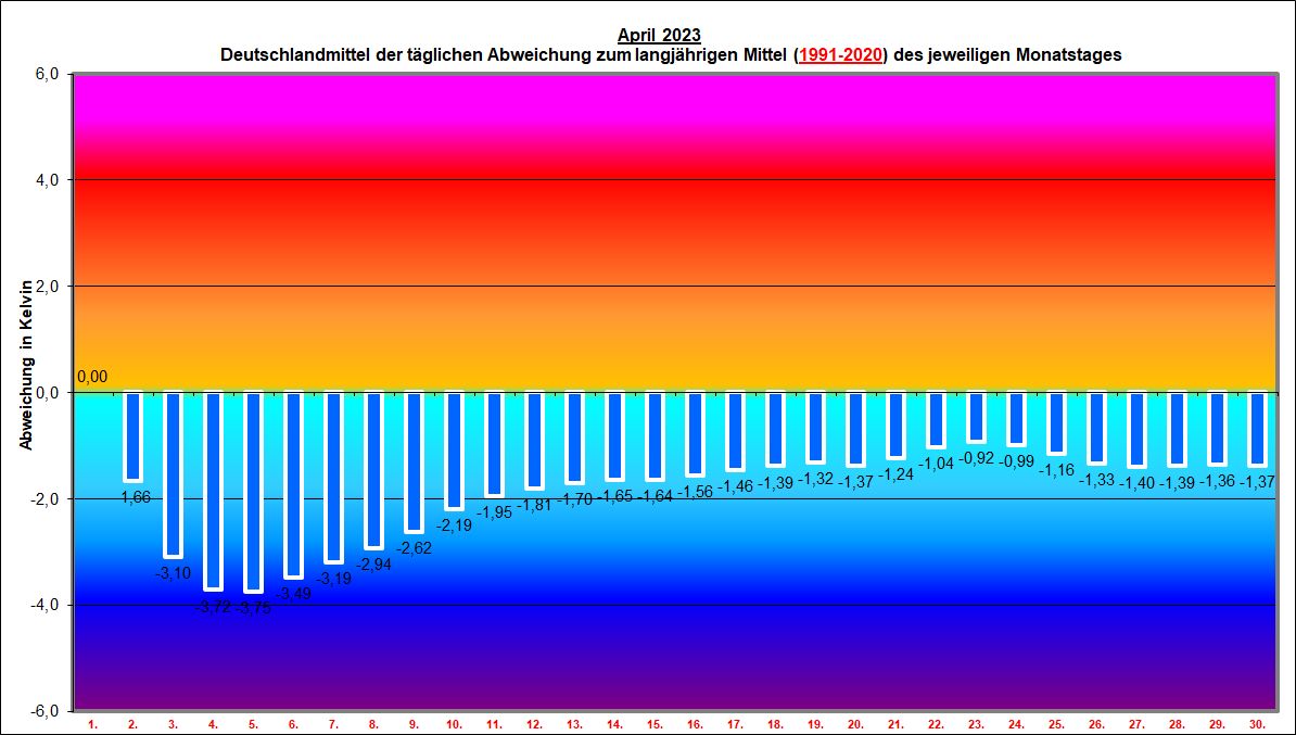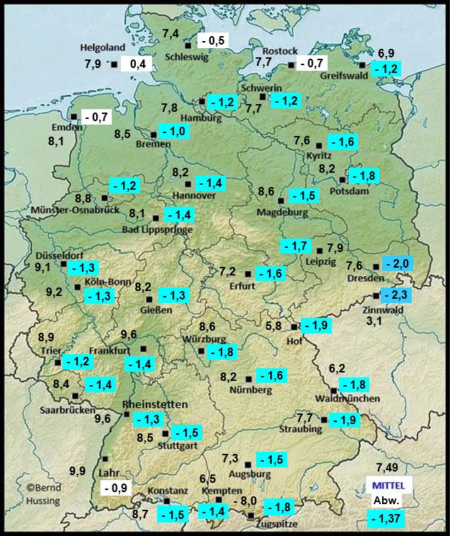 Temperaturmittel, dahinter die Abweichung zum langjährigen Mittel (1991-2020)
