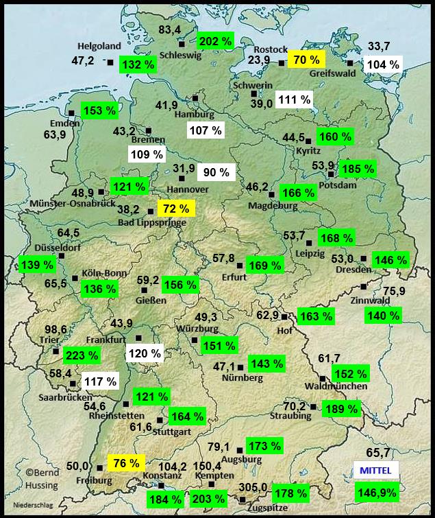Niederschlagssumme, dahinter die Prozente im Vergleich zum langjährigen Mittel (1991-2020)