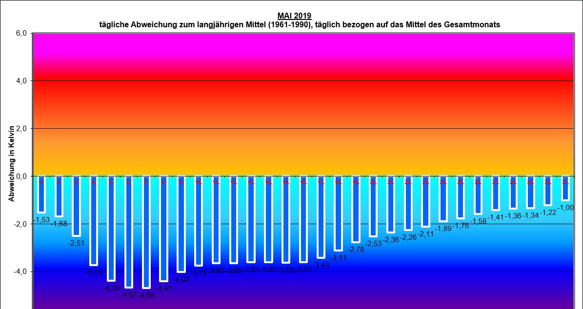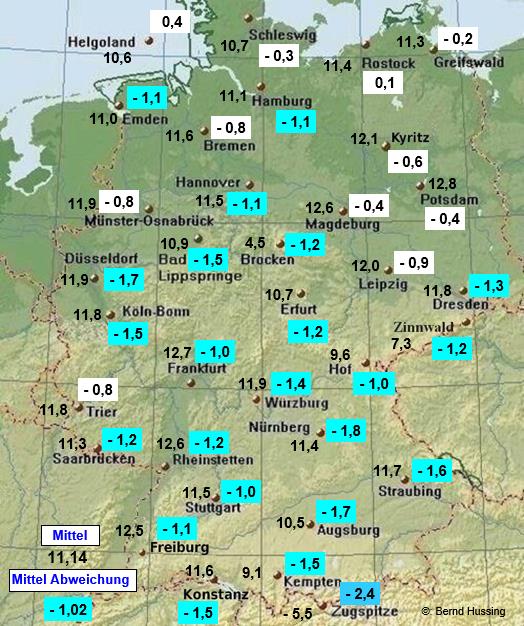 Temperaturmittel, dahinter die Abweichung zum langjährigen Mittel (1961-1990)