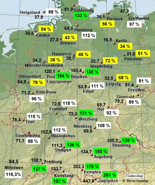 Niederschlagssumme, dahinter die Prozente im Vergleich zum langjährigen Mittel (1961-1990)