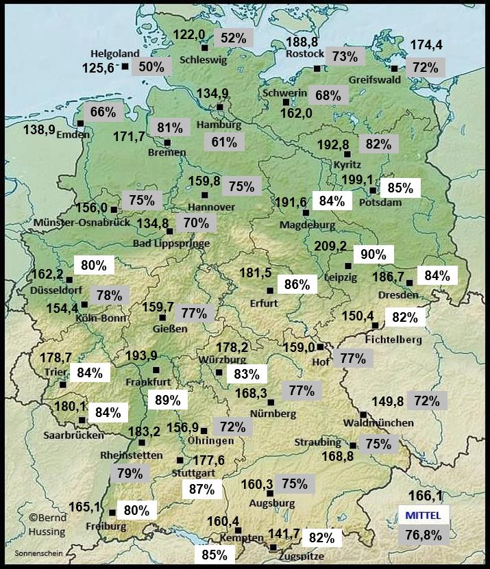 Sonnenscheinsumme, dahinter die Prozente im Vergleich zum langjährigen Mittel (NEU: 1991-2020)