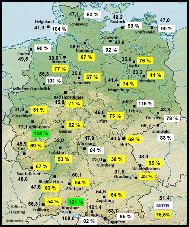 Niederschlagssumme, dahinter die Prozente im Vergleich zum langjährigen Mittel (1991-2020)