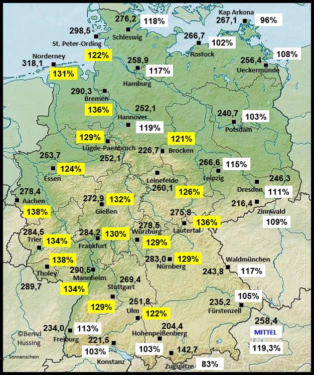 Sonnenscheinsumme, dahinter die Prozente im Vergleich zum langjährigen Mittel (1991-2020)