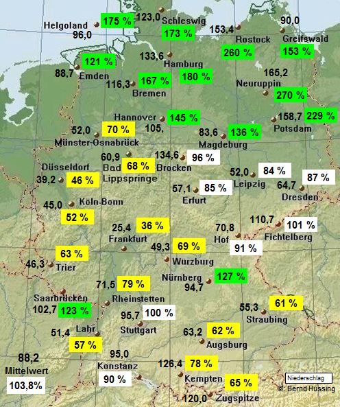 Niederschlagssumme, dahinter die Prozente im Vergleich zum langjährigen Mittel (1961-1990)