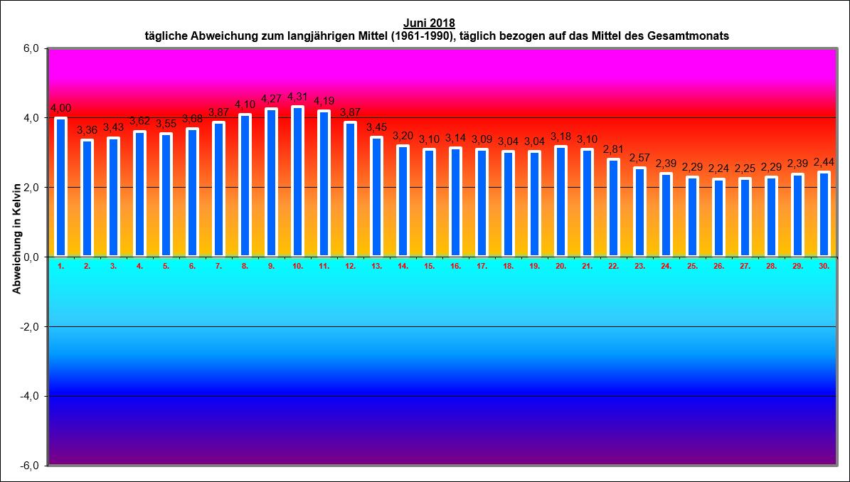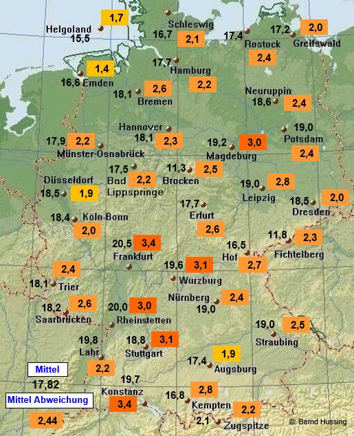 Temperaturmittel, dahinter die Abweichung zum langjährigen Mittel (1961-1990)
