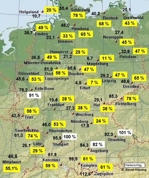 Niederschlagssumme, dahinter die Prozente im Vergleich zum langjährigen Mittel (1961-1990)