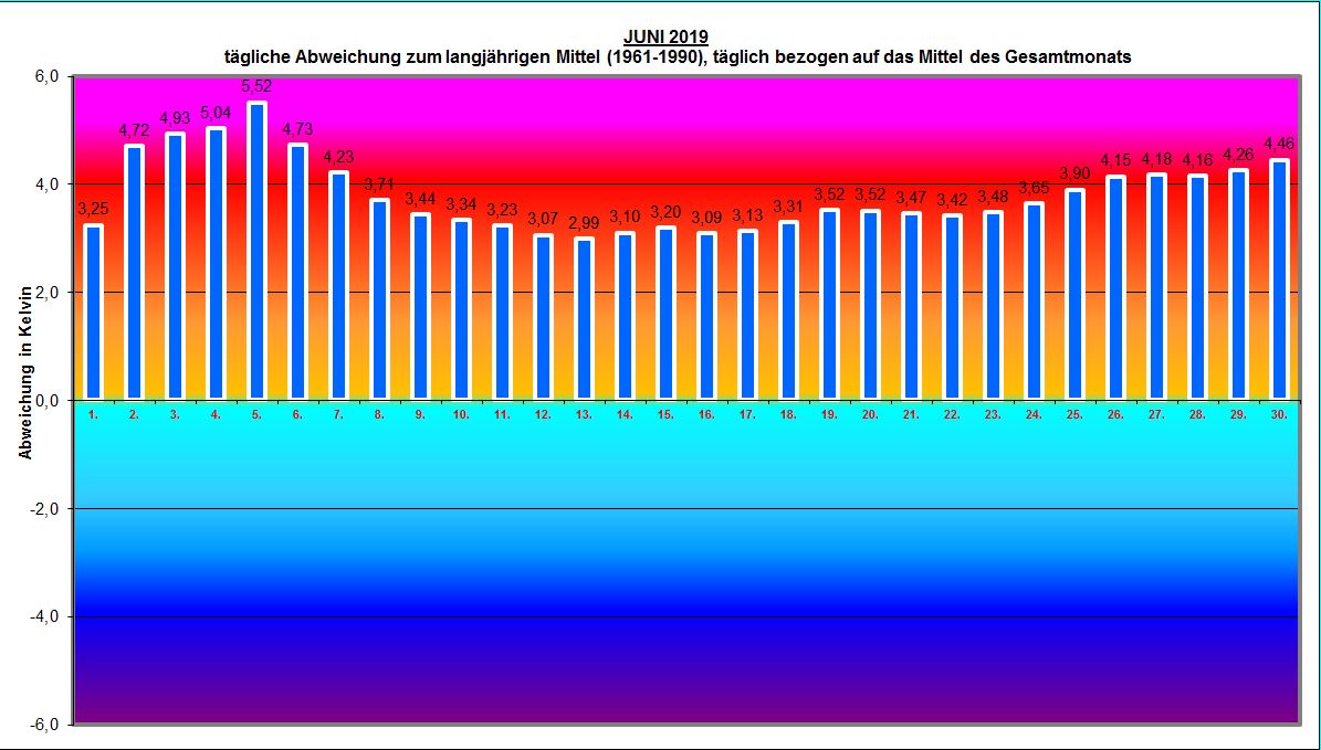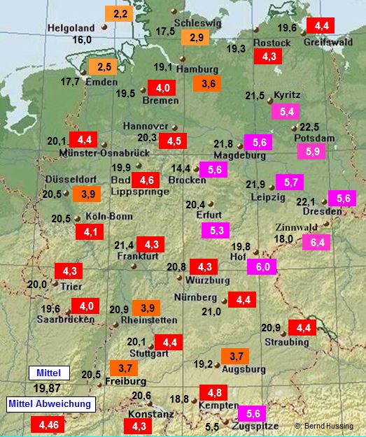 Temperaturmittel, dahinter die Abweichung zum langjährigen Mittel (1961-1990)