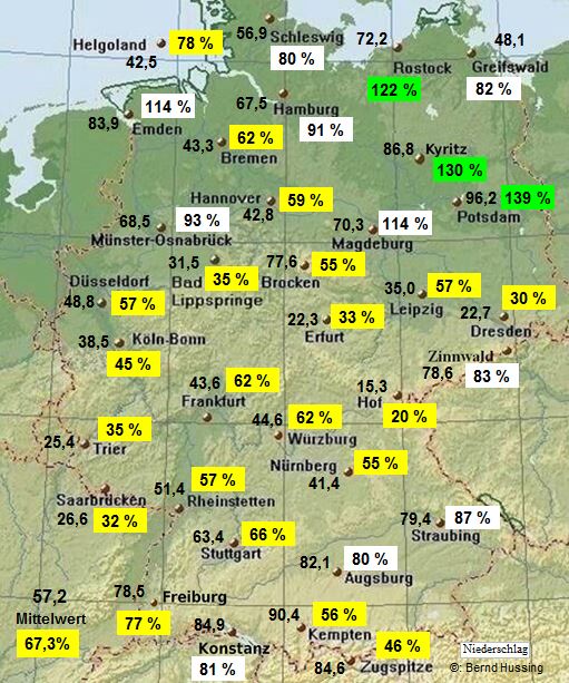 Niederschlagssumme, dahinter die Prozente im Vergleich zum langjährigen Mittel (1961-1990)
