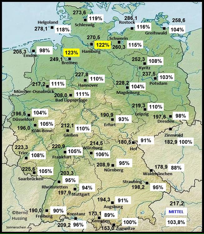Sonnenscheinsumme, dahinter die Prozente im Vergleich zum langjährigen Mittel (1961-1990)