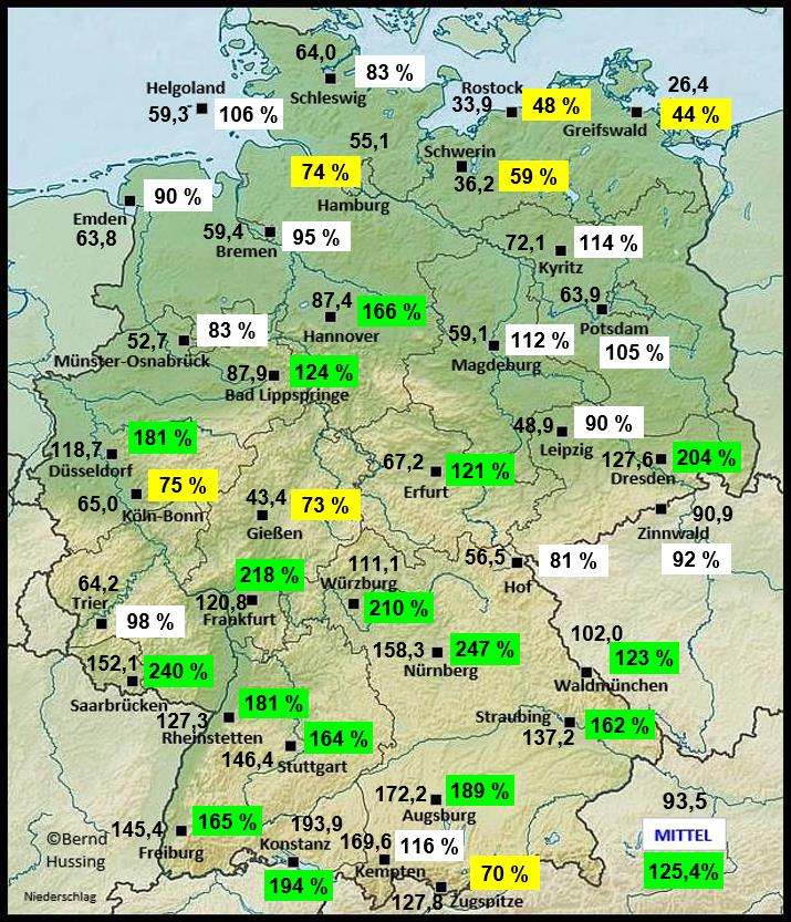 Niederschlagssumme, dahinter die Prozente im Vergleich zum langjährigen Mittel (NEU: 1991-2020)