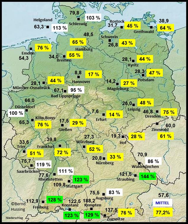 Niederschlagssumme, dahinter die Prozente im Vergleich zum langjährigen Mittel (1991-2020)