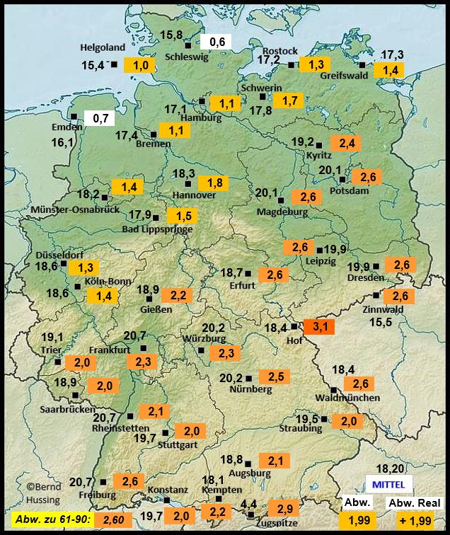 Temperaturmittel, dahinter die Abweichung zum langjährigen Mittel (1991-2020)