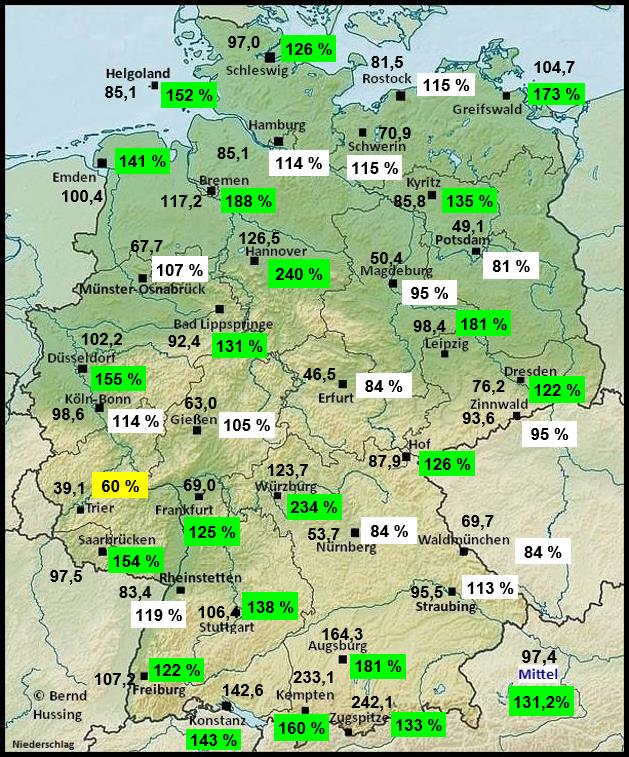 Niederschlagssumme, dahinter die Prozente im Vergleich zum langjährigen Mittel (1991-2020)