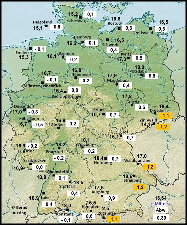 Temperaturmittel, dahinter die Abweichung zum langjährigen Mittel (1991-2020)