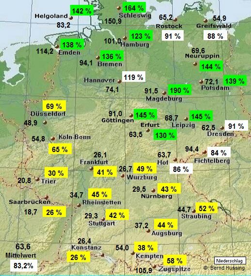 Niederschlagssumme, dahinter die Prozente im Vergleich zum langjährigen Mittel (1961-1990)